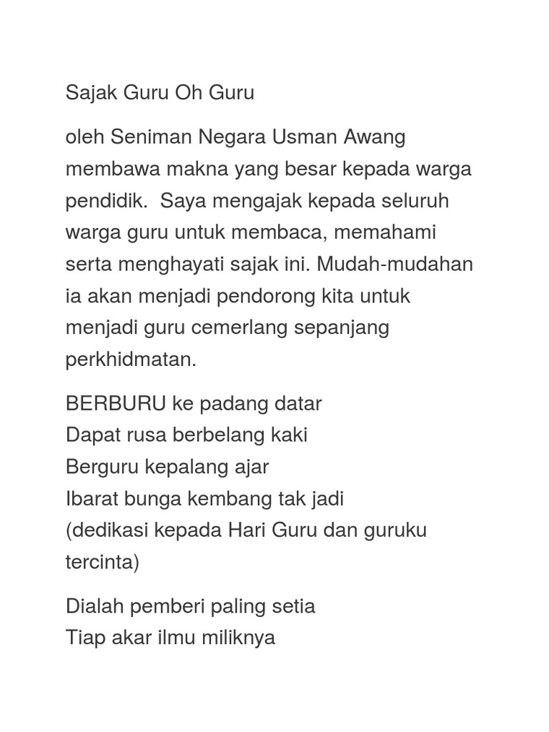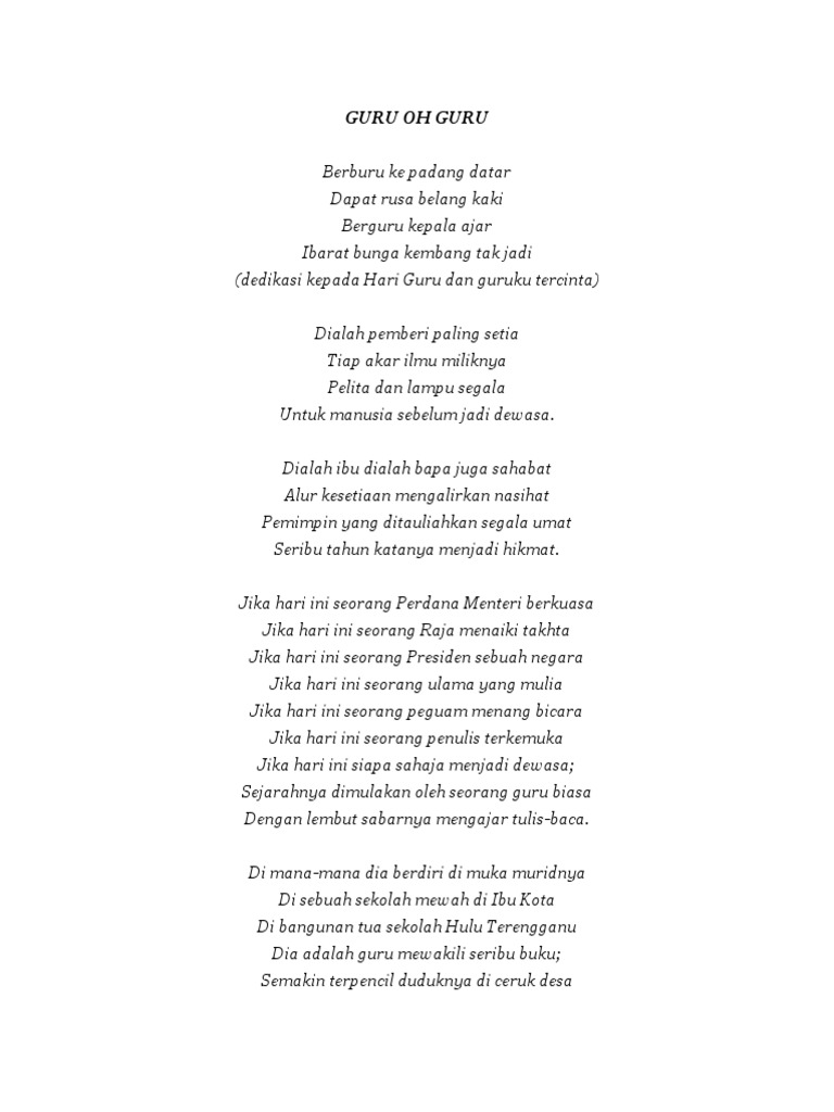 . Up to 24 cash back GURU OH GURU Berburu ke padang datar Dapat rusa belang kaki Berguru kepala ajar Ibarat bunga kembang tak jadi dedikasi kepada Hari Guru dan guruku tercinta Dialah pemberi paling setia Tiap akar. Semakin bererti tugasnya kepada negara. Menjadi kenangan ke akhir hayat.